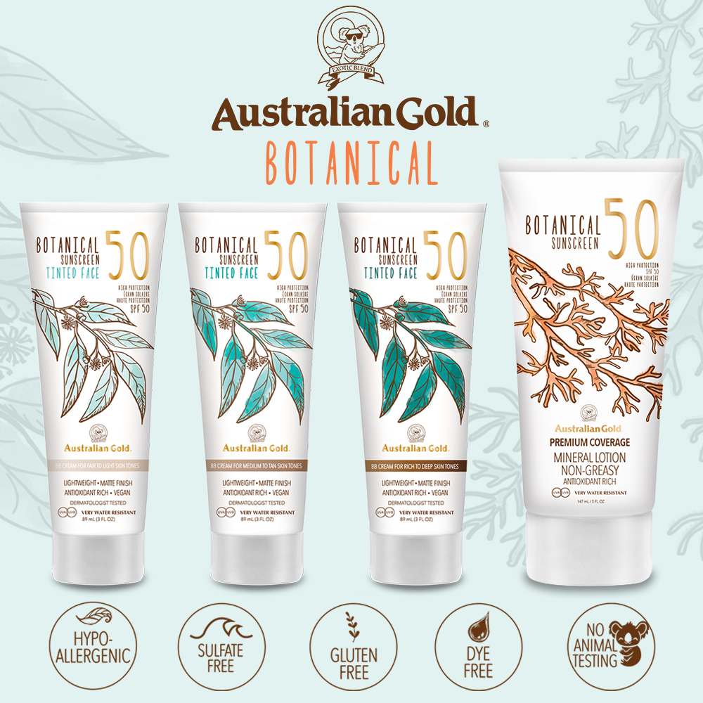 Die "Botanical"-Serie von Australian Gold ist Sonnenschutz und Umweltschutz in einem, die Deine Haut pflegt und sie zugleich straffer und strahlender aussehen lässt. Die Sonnenschutz-Produkte sind weder klebrig noch fettend, ziehen schnell ein, sind schweiß- und wasserresistent und bestens für hypoallergene Hauttypen geeignet.